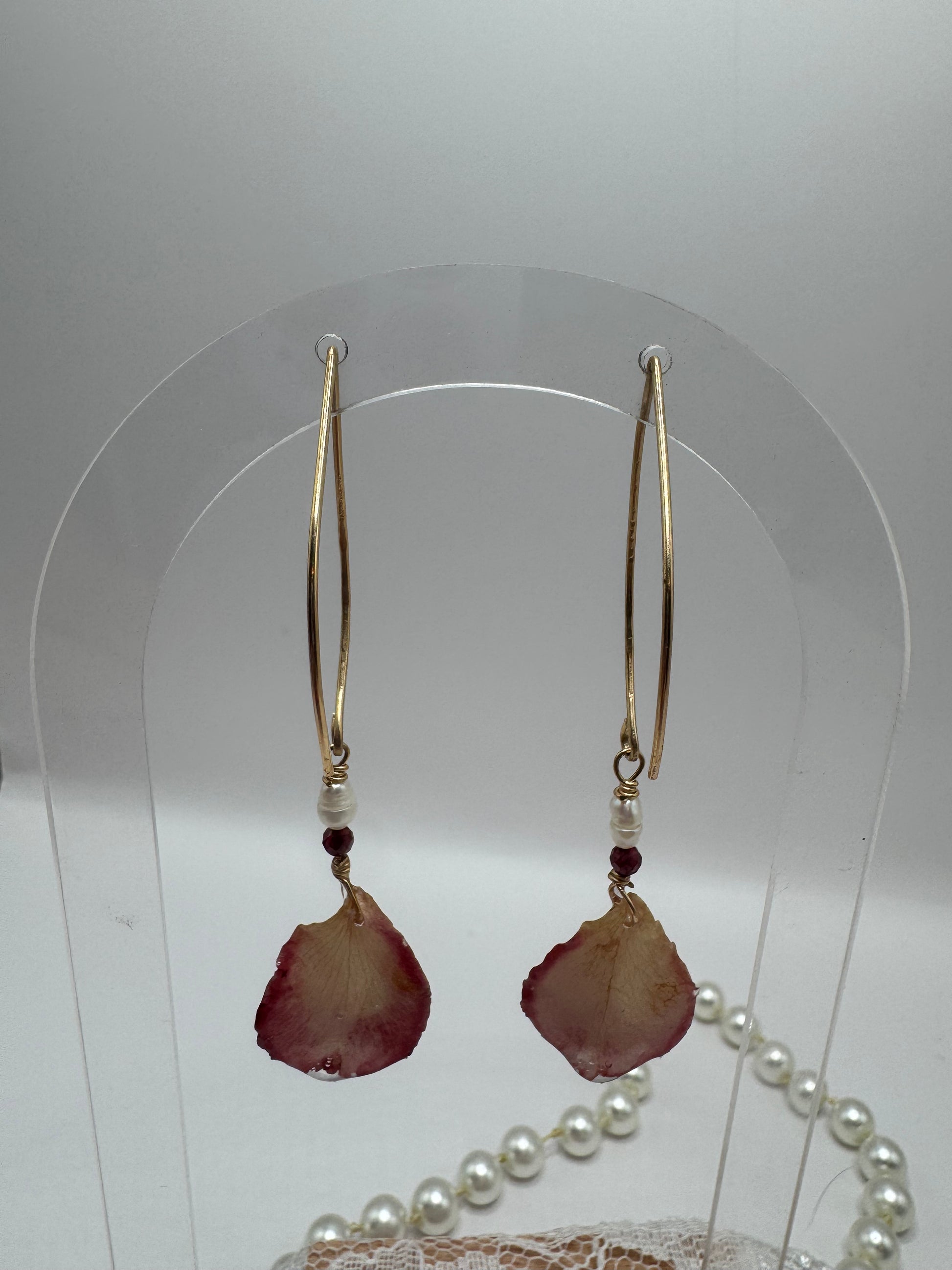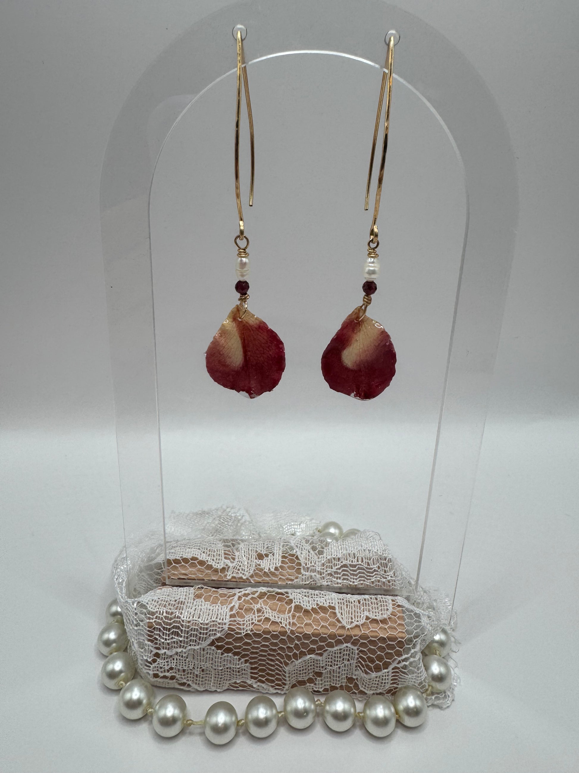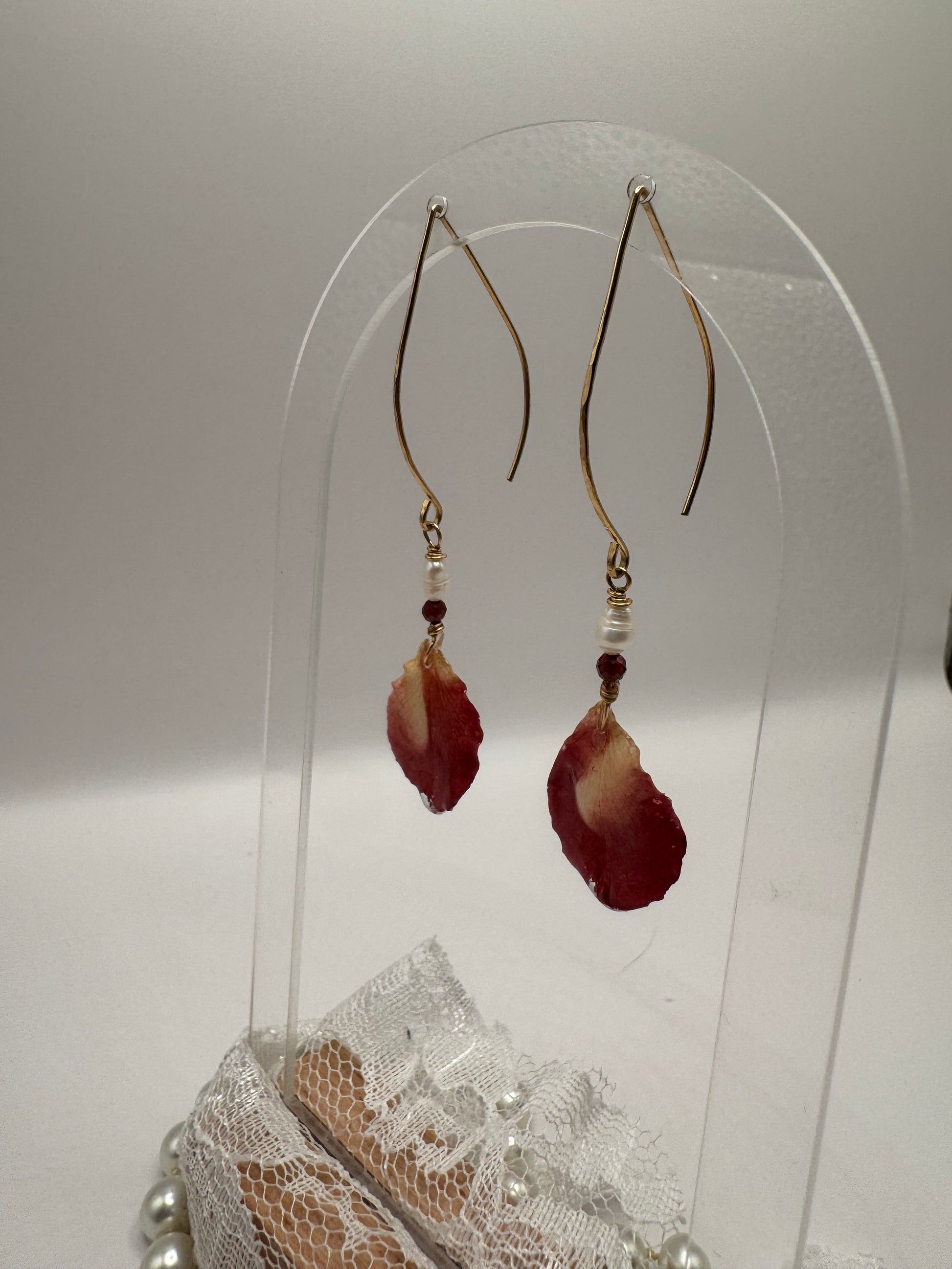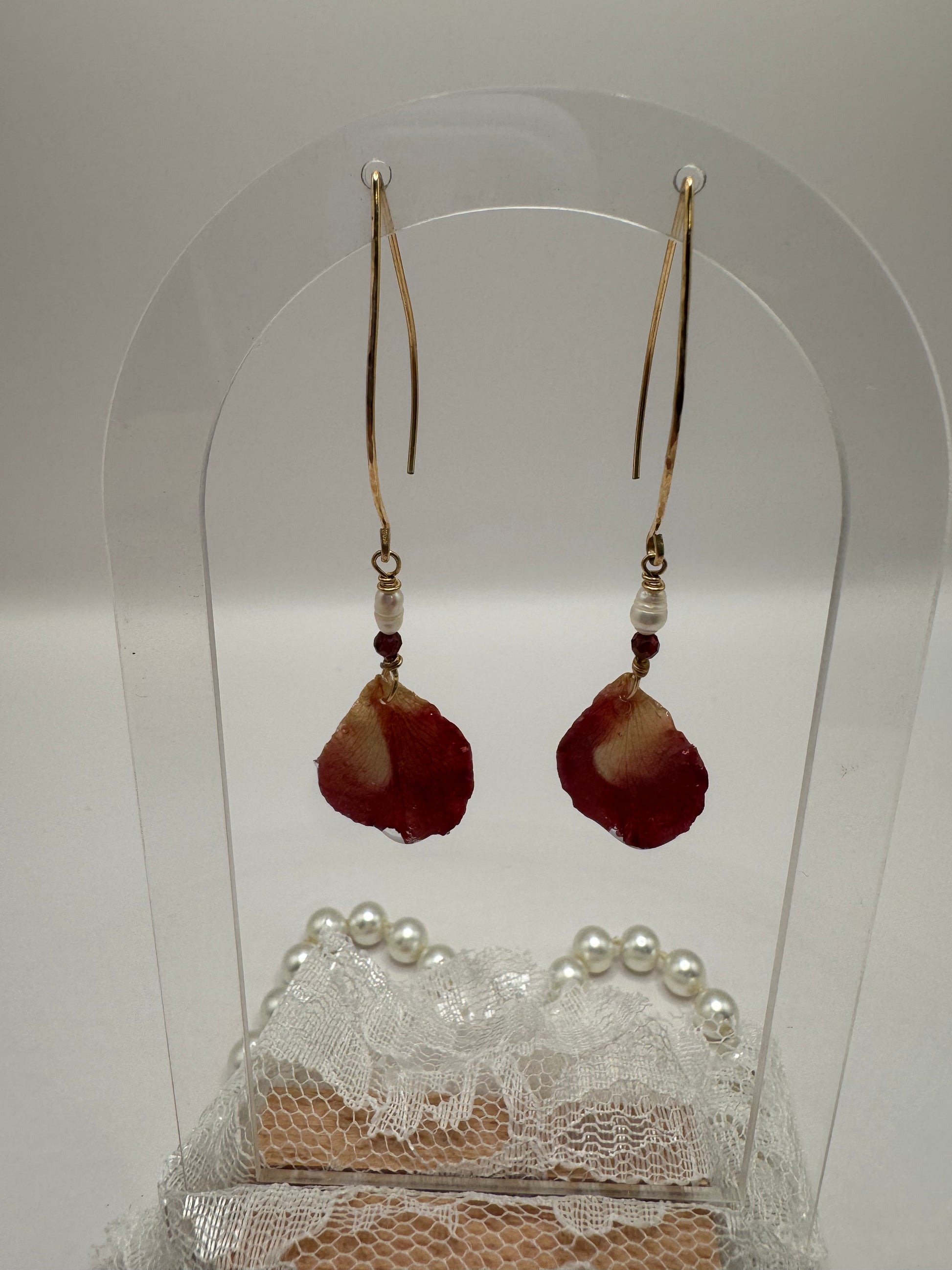 Delicate real rose petals are carefully preserved and paired with luminous pearls and deep crimson accents, creating earrings that feel both timeless and intimate. Each petal carries its own natural variation—soft edges, subtle curves, and gentle imperfections—making every pair truly one of a kind.