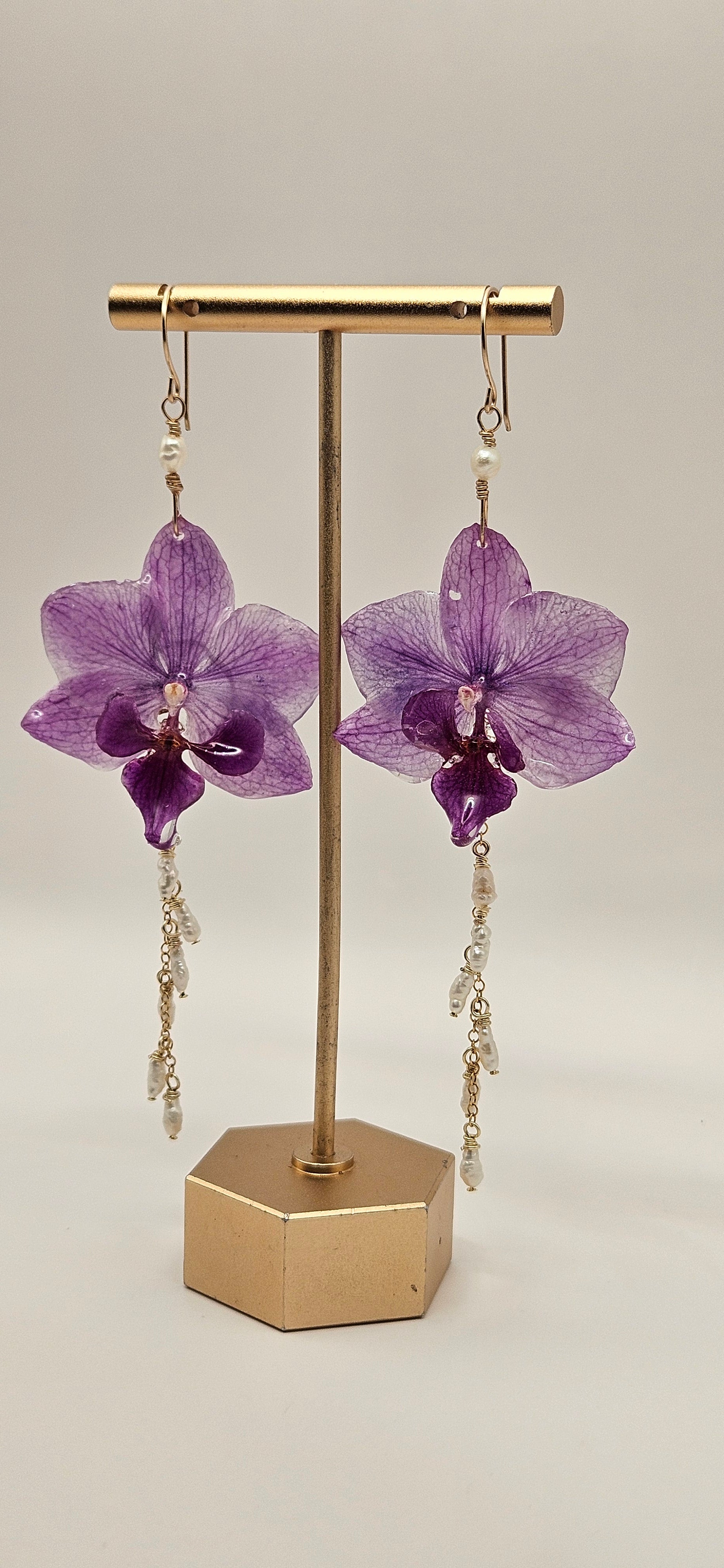 Custom order real purple Orchid earrings hand painted with resin on 14k gold filled hooks, accented with fresh water rice pearls. The purple orchid is about 1.5 inches wide, and 1.25 inches in height.